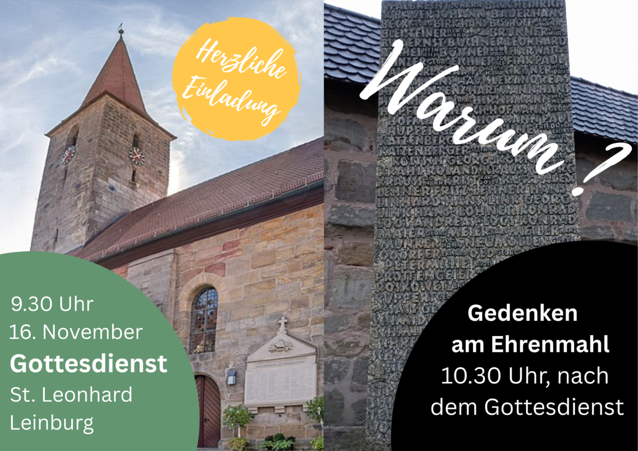 Das Gedenken an die Opfer der beiden Weltkriege in Entenberg ist um 9.00 Uhr am Denkmal vor der Kirche. Mit dabei sind der 2. Bürgermeister Christian Palm und die Reservistenkameradschaft. Für die musikalische Umrahmung sorgt der Posaunenchor und der MGV Entenberg in Union mit dem Gesangsverein Germania aus Leinburg. Im Anschluss ist Gottesdienst mit Diakon Roland Lehner. Thema ist unsere Verantwortung als Christen angesichts neuer Bedrohungen.