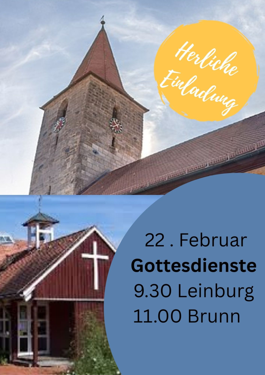 Wir laden herzlich ein zum Gottesdienst mit Frau Pfarrerin Schlenk am kommenden Sonntag, 1. Februar, um 9.30 Uhr, in Leinburg und um 11.00 Uhr in Entenberg.