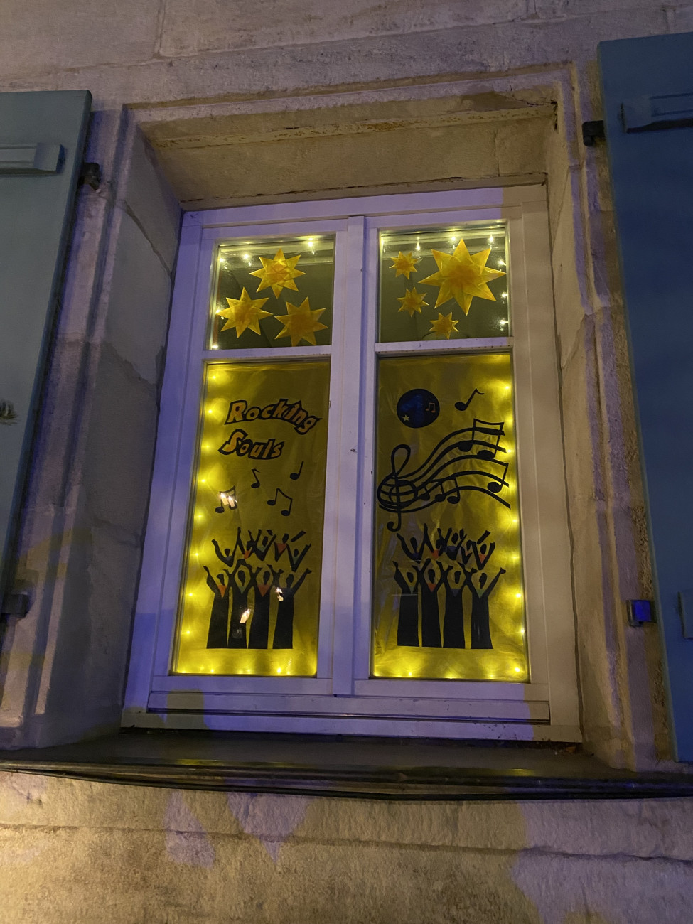 Das erste Adventsfenster leuchtet. Der Weißenbrunner Gospelchor "Rocking Fouls" hat das erste Adventsfenster zum Leuchten gebracht. Abgebildet sind jubelnde Hände und Arme, die den Gospel - das Evangelium - in die Welt tragen. Eine wunderbar kreative Umsetzung. Verbunden war die Öffnung unseres 1. Adventsfensters mit dem gemeinsamen Lied "Macht hoch die Tür", mit Gospelklängen, einem Adventssegen und anschließendem Glühwein-Beisammensein im Kirchhof.